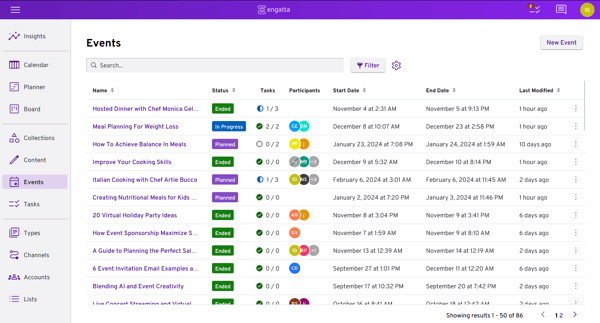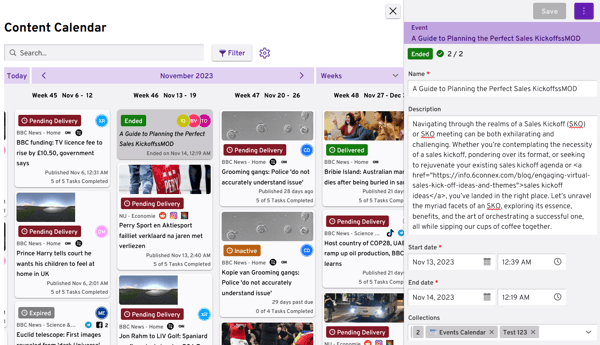 Events are seamlessly integrated into the calendar, allowing you to view and manage both content items and events in one place. Event cards are easily distinguishable by their italic font, making it effortless to identify them. You can perform various actions on events directly from the calendar, such as viewing, editing, deleting, and duplicating, just as you would with content items. The calendar also provides the option to filter and search for specific events or content items, giving you full control and flexibility in managing your schedule.