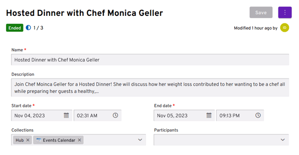 In the details view of an event, you can edit various aspects of the event. This includes specifying the start and end dates, managing the participants, and adding the event to a collection.