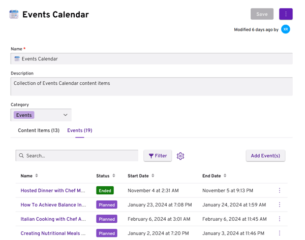 Collections can now contain both events and content items, providing a more versatile way to organize your information. As a result, the details view of a collection has been redesigned to accommodate both types of items. In this view, you can easily add or remove content items and events, each displayed in its tabbed view. This enhancement allows for seamless management of your collection, giving you greater control over your content and events.