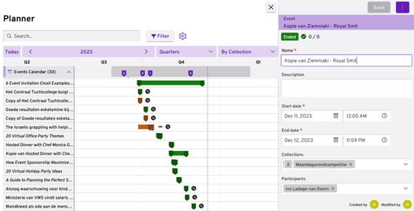 Events are displayed in the planner, utilizing the start and end dates specified for each event. From the planner, you can conveniently open, edit, delete, and duplicate events. Additionally, events are presented as part of the collection they are associated with.
